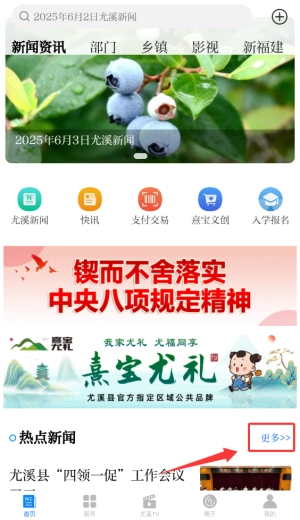 1、打开智慧尤溪应用后,在首页底部的导航栏中找到“更多”这个入口,该板块汇集了各类最新的本地重要资讯。