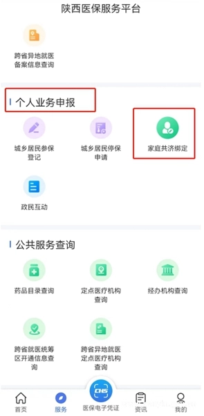 2.进入首页后,点击【服务】-【个人业务申报】-【家庭共济绑定】