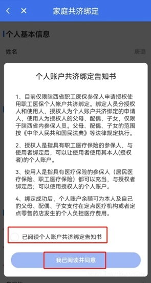 3.进入页面,仔细阅读《个人账户共济绑定告知书》,阅读完成后勾选【已阅读个人账户共济绑定告知书】并点击【我已阅读并同意】