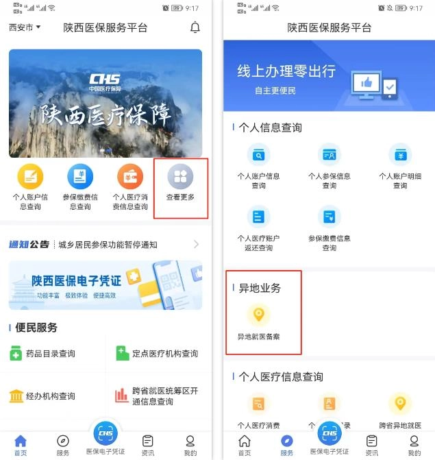 1.登录【陕西医保】,点击【查看更多】,点击异地业务中的【异地就医备案】
