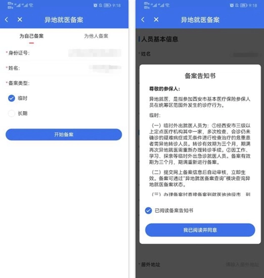 2.进入异地就医为自己备案页面后,选择备案类型【临时/长期】,点击开始备案,阅读【备案告知书】,点击【我已阅读并同意】