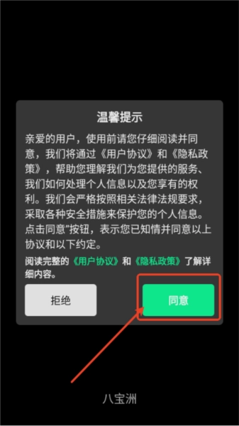 在手机上打开八宝洲行动助手后,需同意该软件的使用政策。