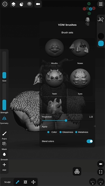 - 雕刻工具:标准、粘土、粘土堆积、平滑、遮罩、膨胀、移动、修剪、展平、拉动、捏合、折痕、动态修剪、动态展平、图章、VDM 画笔等。