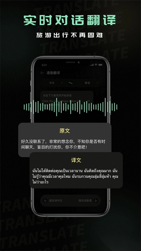 只需轻点操作,我们的语音识别功能就能把泰语口语转化为目标语言的文本,助您轻松理解泰语口语,是一款实用便捷的翻译工具。它不仅能精准传达泰语的含义,还可将翻译结果分享至微信、QQ等社交平台,高效又省心。