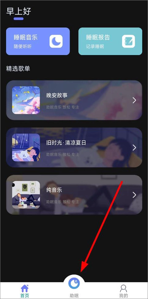 1、进入本站后点击打开,首页设有睡眠音乐、睡眠报告、精选歌单等版块,点击“助眠”即可。