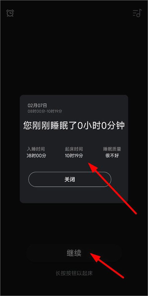 4、长按继续按钮可以查看入睡时间、起床时间、睡眠质量。