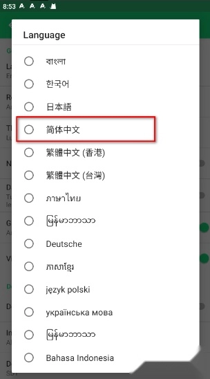 2、点击这里的language 找到中文选项即可。