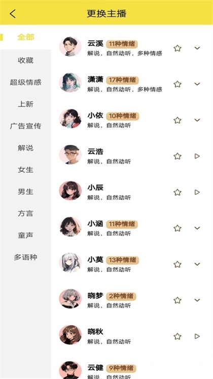 2、多个合成主播:小明配音男声+女声+童声+方言随意切换,发音人任您选择;