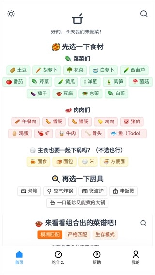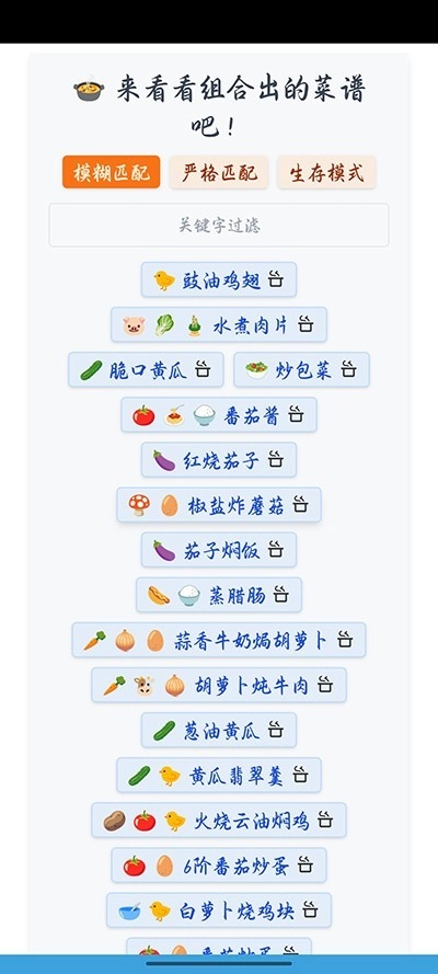 4、生成的菜谱一共分为三个模式:模糊匹配、严格匹配、生存模式;