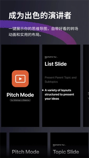 演说模式:一键即可以用幻灯片的方式展示你的思维导图,自动生成转场动画和布局,开启演说新体验。