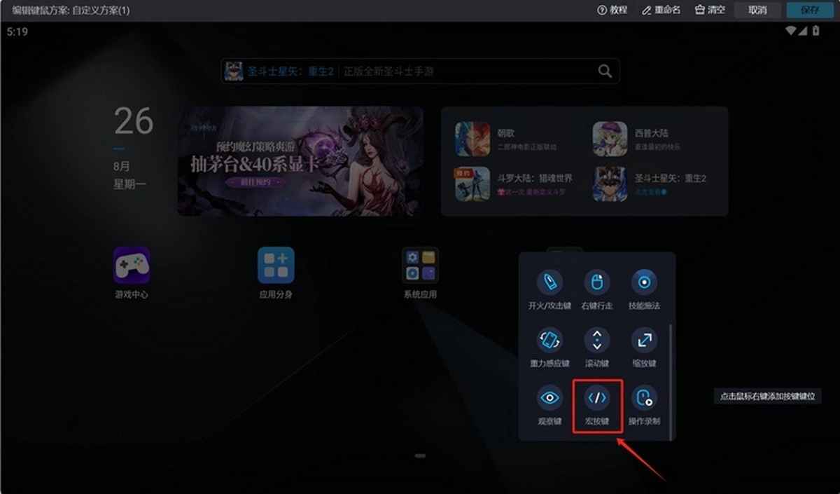 第三步,设定宏按键键值,之后点击宏按键右下角编辑图标-输入指令并保存,再点击模拟器右上角保存,最后点击对应设置的宏按键键值即可。宏按键指令:mouselocked_switch