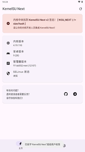 3、刷入成功后,用户再次打开KernelSU Next,就不会出现如下图所示的红色区域了,代表你也刷入成功,可以使用更多功能了