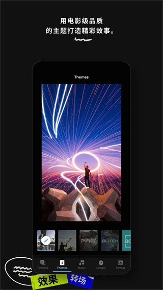 只需点击一下,即可立即将你的影像转换为可分享的视频,选择一个主题即可获得酷炫特效、转场和配乐。