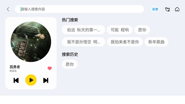 6、用户可以通过输入歌曲或歌手,搜索自己想要的音乐进行收听,支持文字输入和语音输入。