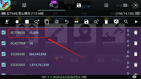 9、搜索完毕后,我们发现搜索出来的地址还是有很多,此时我们在游戏中消耗一些金币(消耗后的金币为11000)并重新操作6、7、8步骤(可重复操作)。