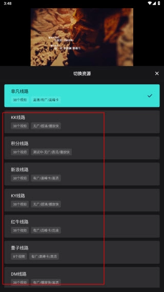 3、在这里我们可以选择其他的线路,如KK线路、积分线路、新浪线路等等,如果某部影视播放失败,尝试切换线路看是否有效