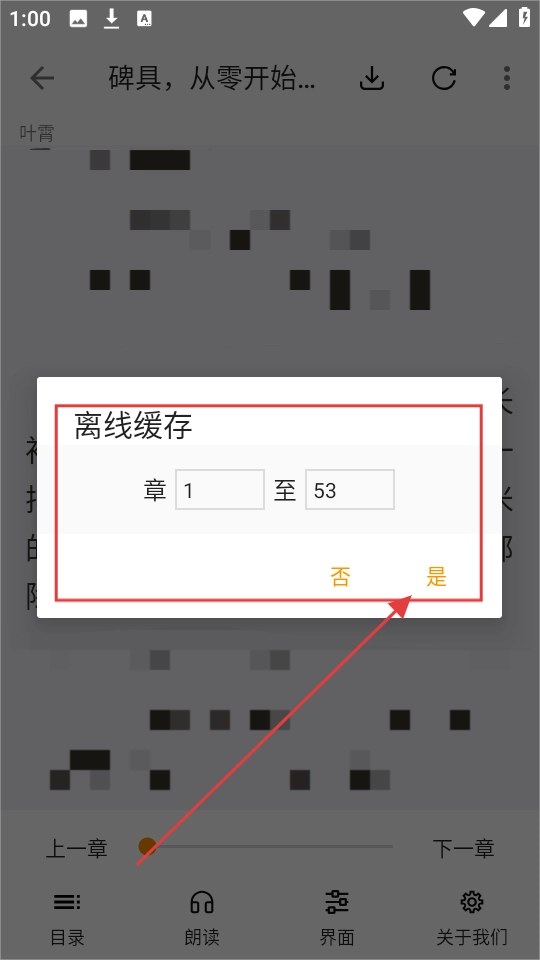 4、在离线缓存弹窗,选好要缓存的章节范围,点击【是】,就能开始缓存,方便离线看。