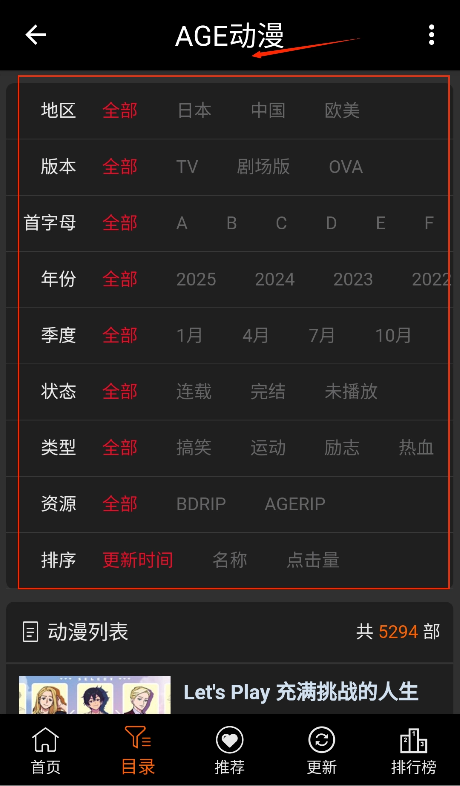 2、目录页面:会对动漫进行地区、版本、首字母、年份、季度等排列,方便用户寻找;