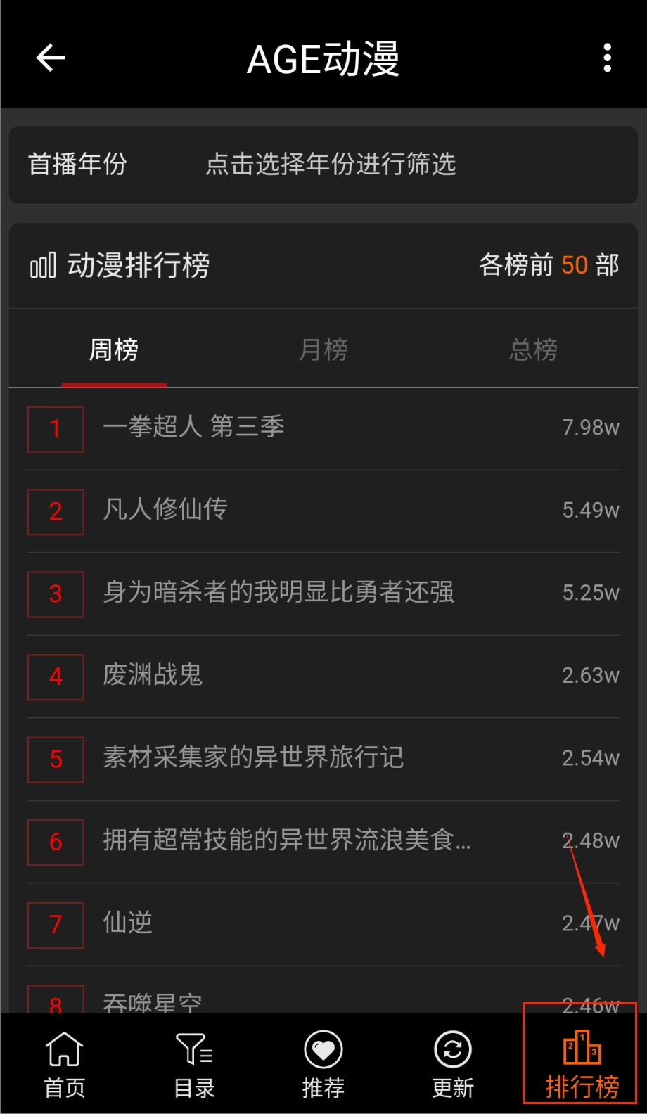 5、排行榜页面:会将每一年的前75部动漫进行排列。