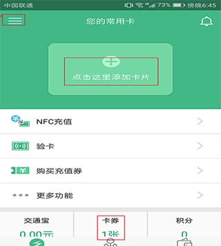 2、打开手机的NFC功能。如图所示,点击“点击这里添加卡片”,在随后的页面中手动或将交通卡贴紧手机将交通卡卡号添加到这里。