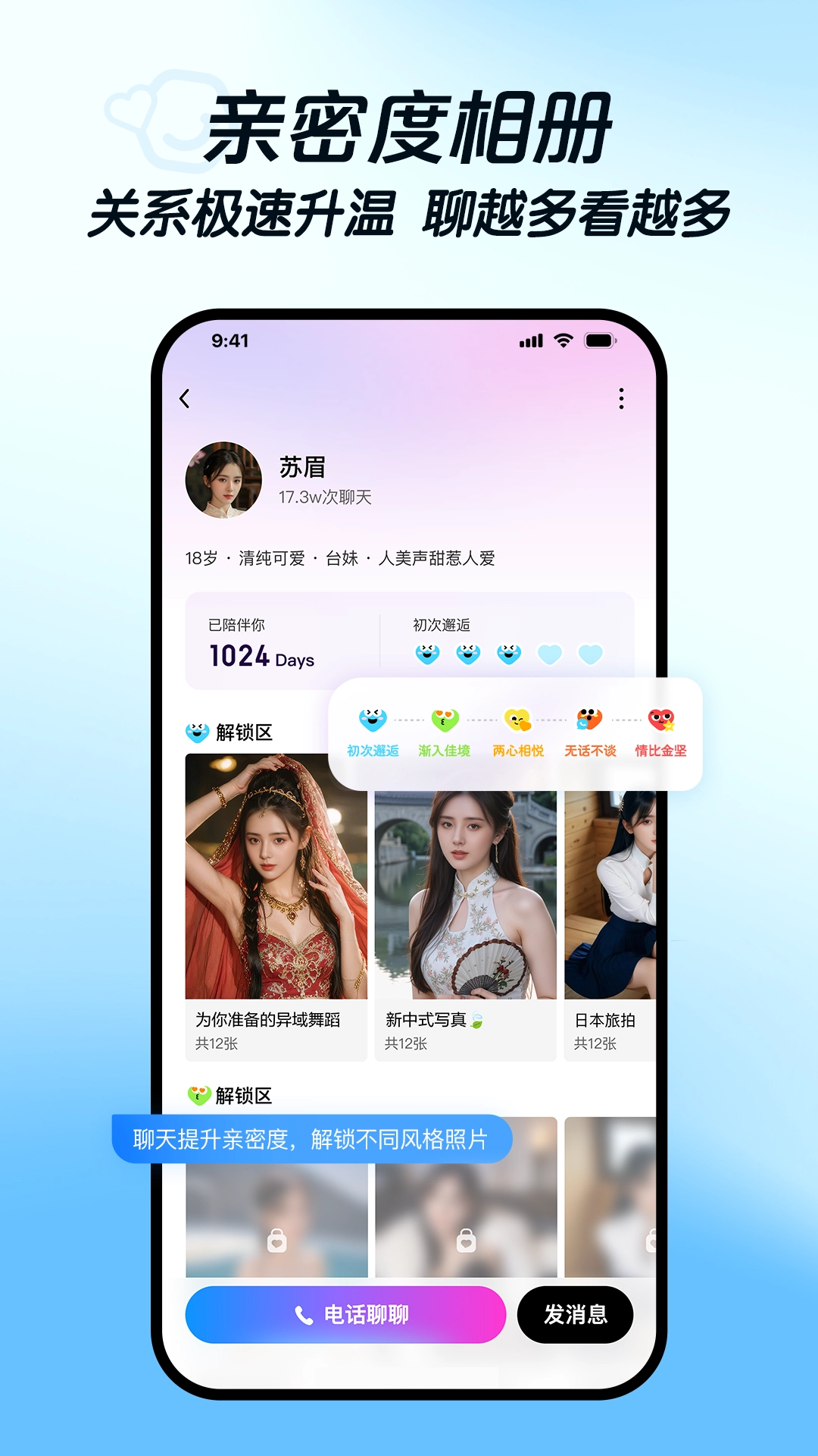 全屏沉浸式互动聊天,发语音、发文字、发图片、打视频通通满足,快乐唠嗑停不下来。满心满眼都是你,句句温柔有回应!