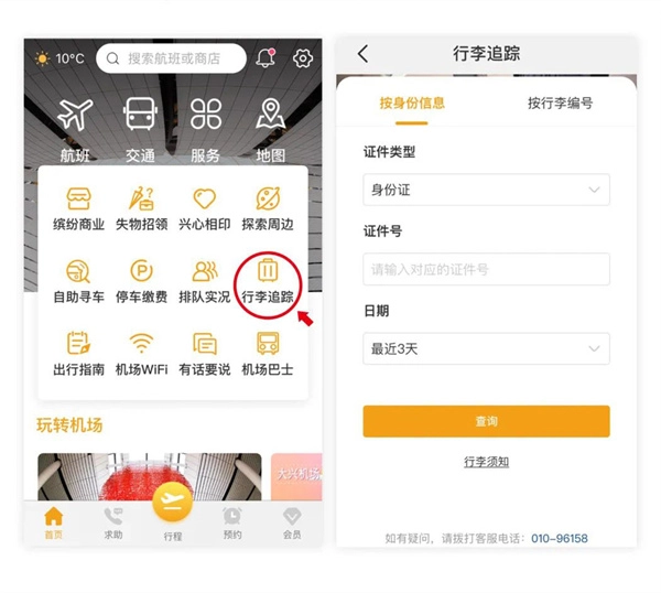 进入"行李追踪",可通过身份证号或行李编号查询进出港行李实时状态