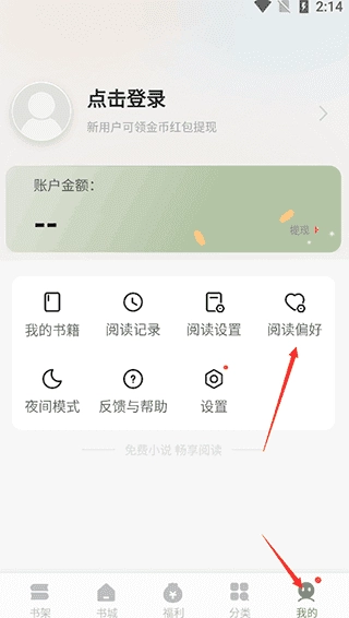 3、若希望获得更符合口味的推荐内容,可进入右下角“我的”页面,选择“阅读偏好”进行标签设定。