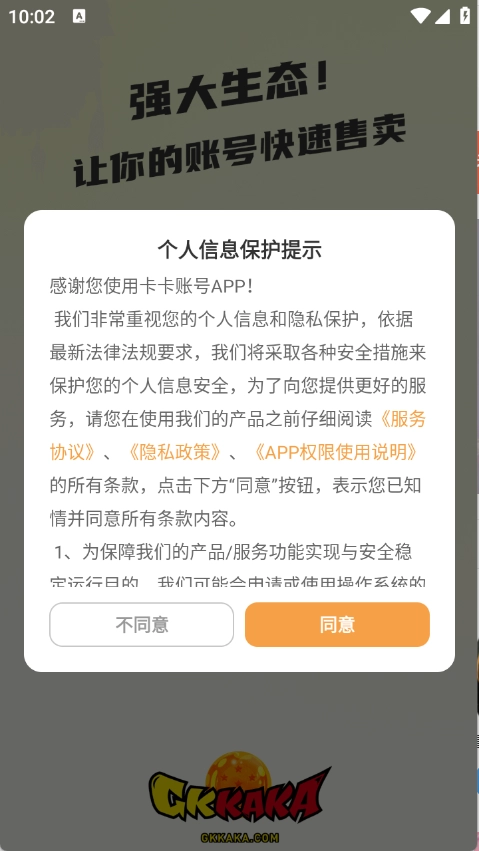 1.启动卡卡账号应用程序,在使用前需同意隐私政策和用户协议,随后完成账号注册与登录操作。