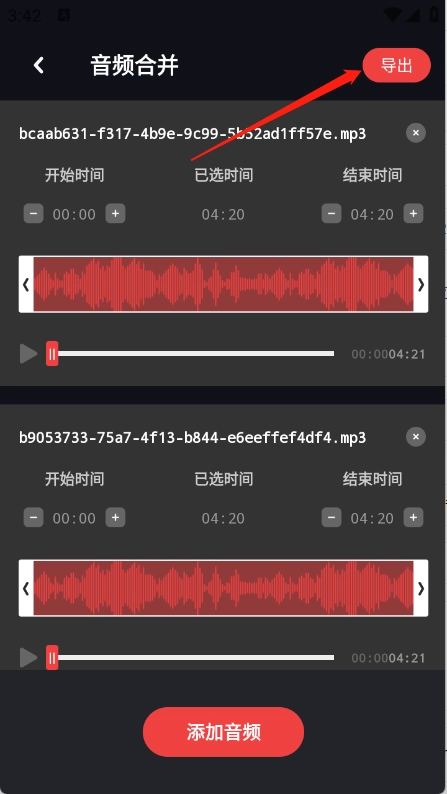 4.根据自身徐供求将音频进行合并,点击右上角的导出