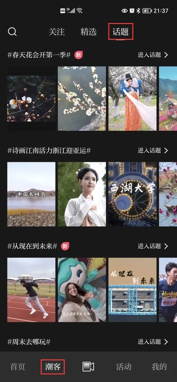 如果作品是带话题发布的,可在潮新闻客户端点击“潮客”频道,进入“话题”栏目中的相应话题,切换“最热”或“最新”,查看最受欢迎的和最新上传的作品,就能快速找到自己新发布的作品了。也可点击右下角“我的”,进入“个人主页”,查看自己的作品和动态。