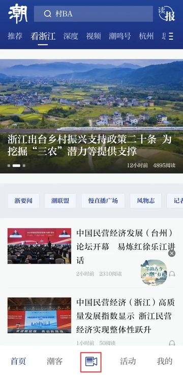 打开潮新闻客户端,点击正下方的“摄像机”图标,即可拍摄或上传作品。