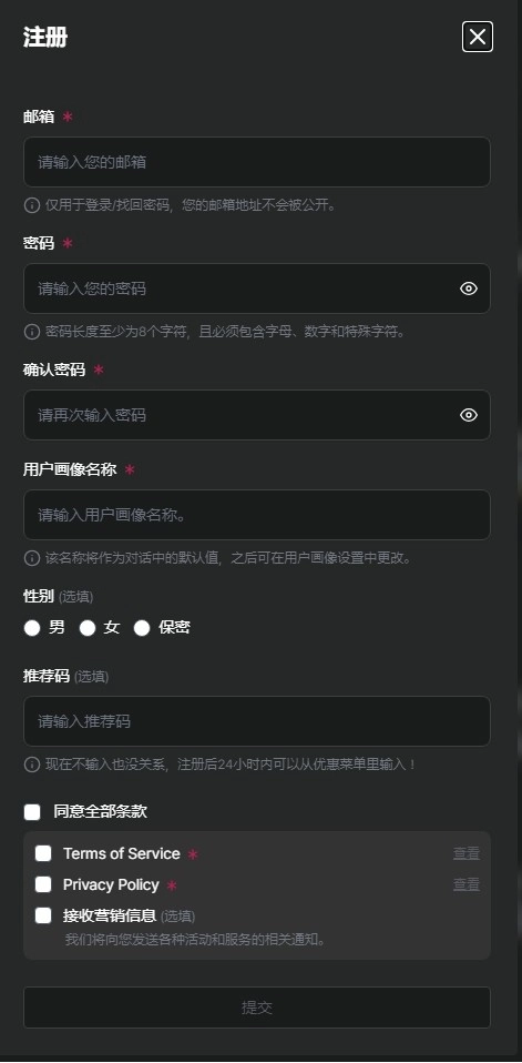 3、填写注册信息提交即可完成账号创建。