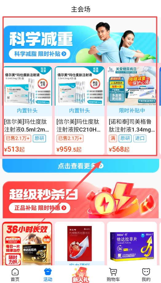 3、如果想参加特定活动,进入后能看到信尔美玛仕度肽注射液等热门商品,方便你快速对比并下单购买。
