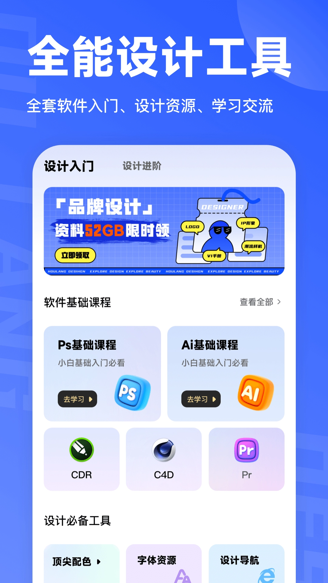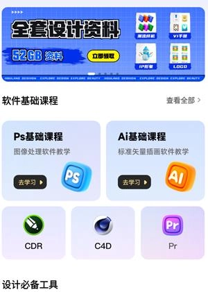 1.打开后浪学设计App,进入首页后,能看到软件基础课程以及设计必备工具。