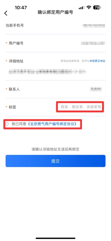 ④ 对用户编号与地址信息进行核对,录入标签,并勾选“我已同意《北京燃气用户编号绑定协议》”