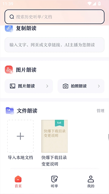 讯飞有声在使用上也非常的简单,用户只需要将自己想要听的文字内容上传即可。另外,应用还支持TXT、PDF等格式的文件,让用无需转换格式,直接就可以导入,简单方便。