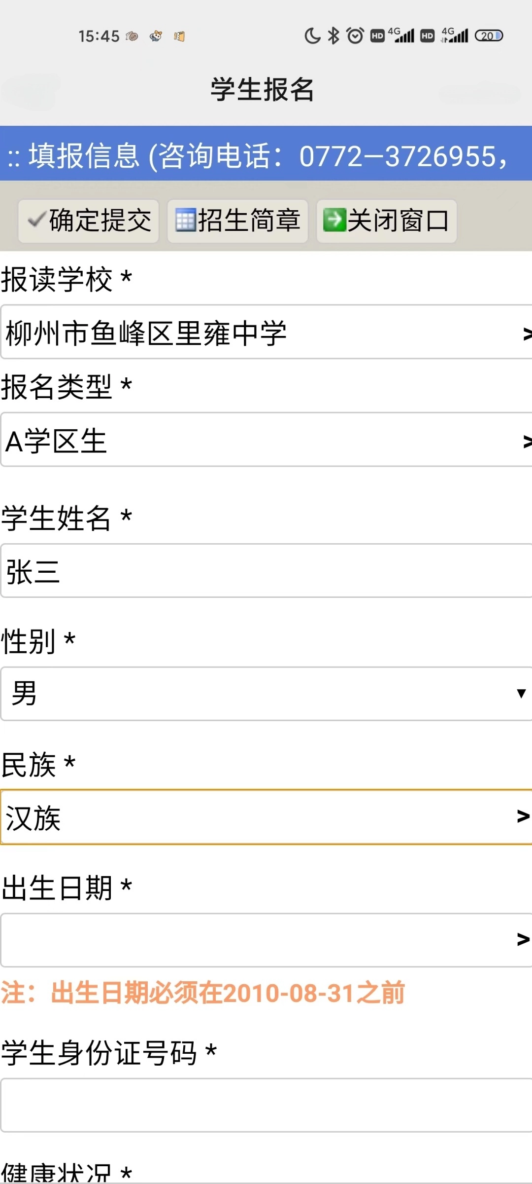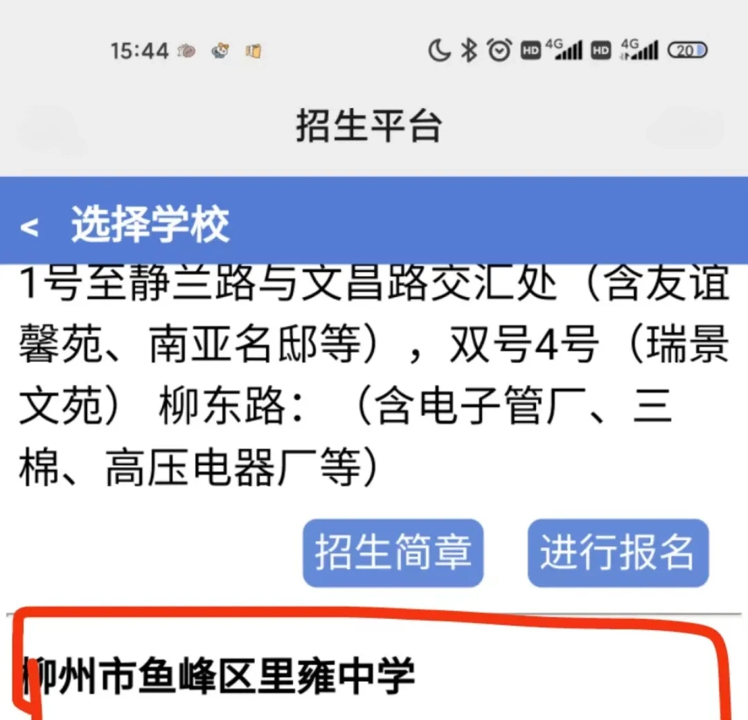下拉找到“柳州市鱼峰区里雍中学”,点击报名。注意:必须先阅读《招生简章》,否则无法报名。