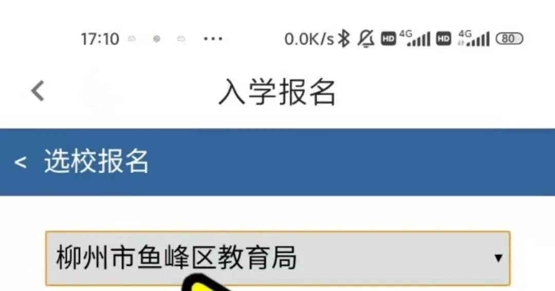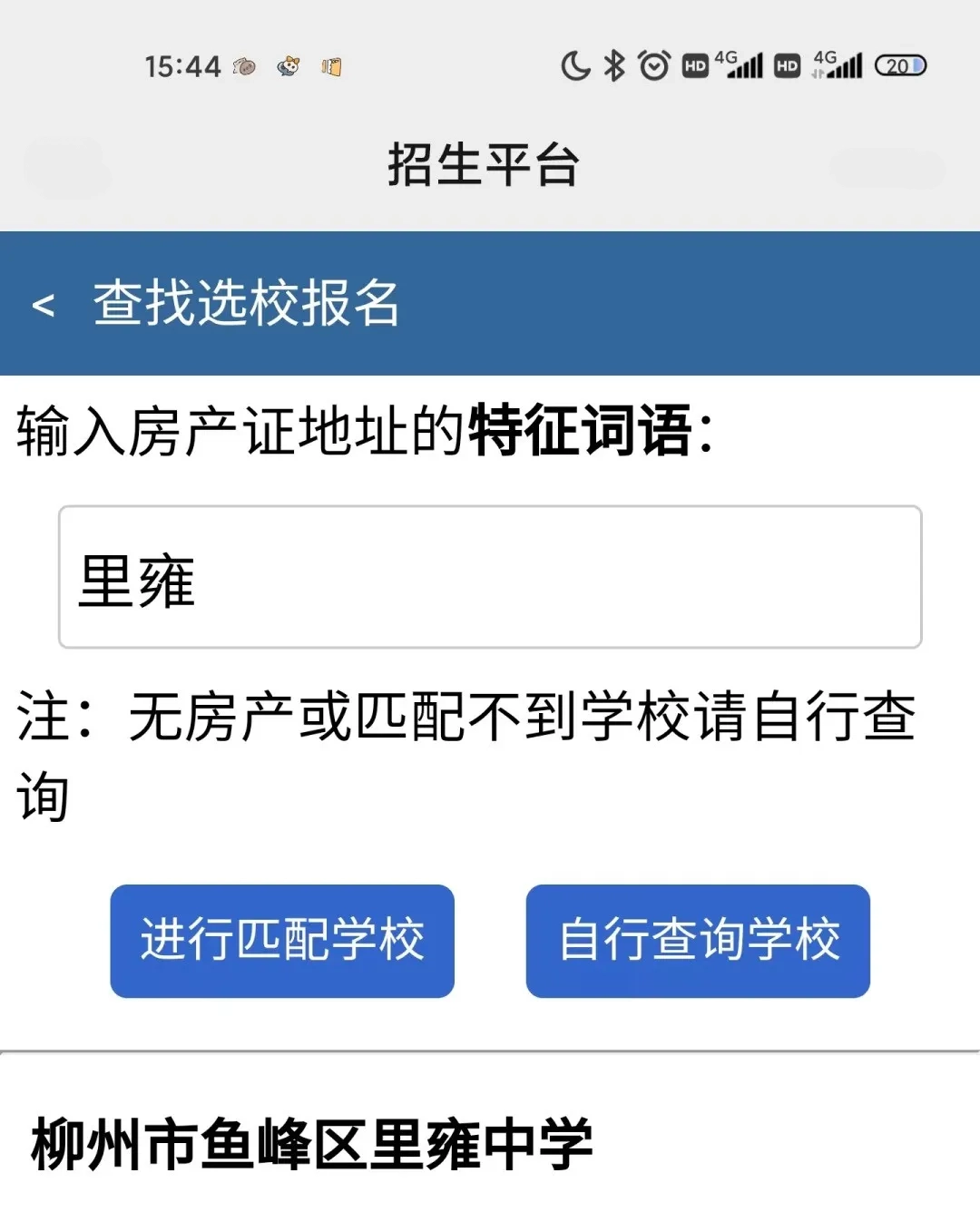 方法一:输入房产证地址关键词“进行匹配学校”,找到“柳州市鱼峰区里雍中学”,点击报名。