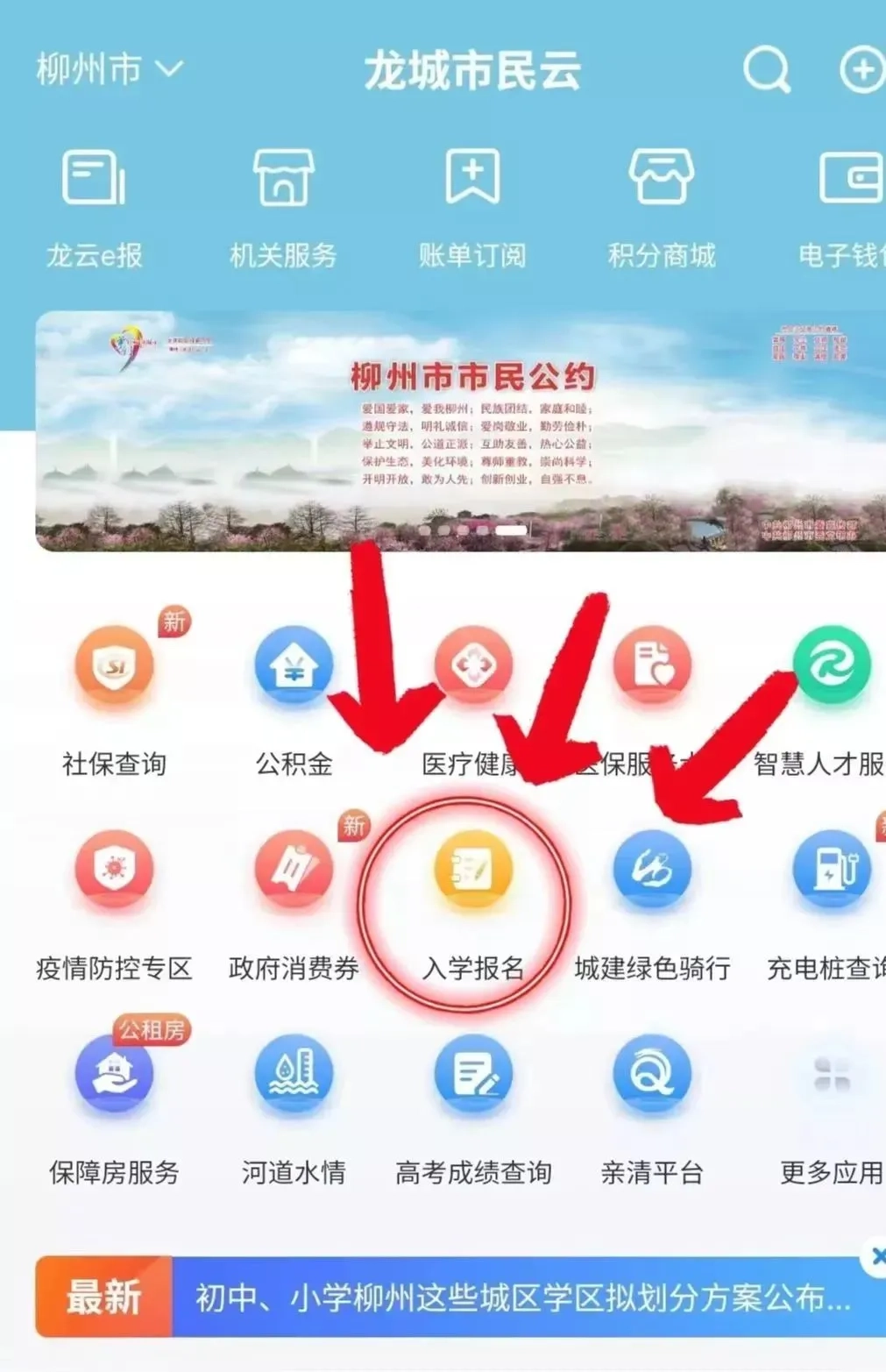 1.好后打开进入“龙城市民云”界面,点击“入学报名”,进入报名平台。