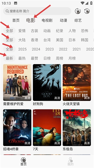 2、切换到电影分类利用全部类型,地区,年份及最新排序等筛选条件精准找到心仪的电影。