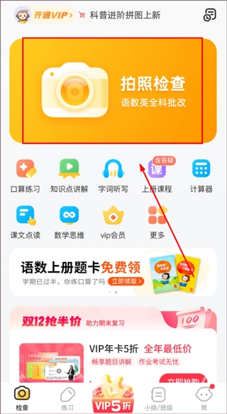 3、打开小猿口算“检查”界面以后点击“拍照检查”