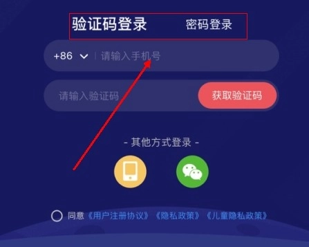 1、在登陆界面选择验证码进行验证注册,或者使用密码进行登录