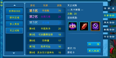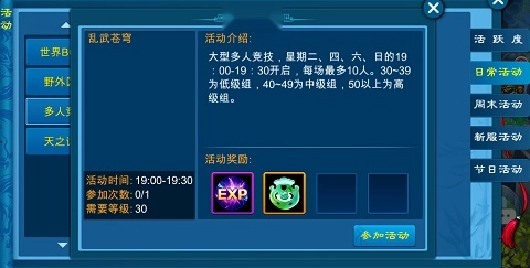 周六18:00-22:00开启,3人组队,共同斩妖除魔。可获得大量灵气,还等什么极品装备就靠它了。