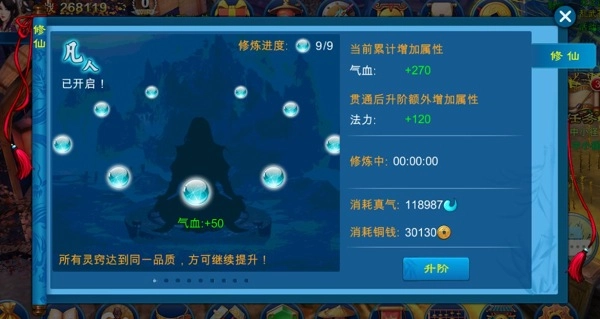 3、每条修仙线路都得修炼到圆满状态才能升阶,升级过程中会消耗真气和铜币,而紫色与橙色线路的升阶,还额外需要消耗指定道具【千年神水】。