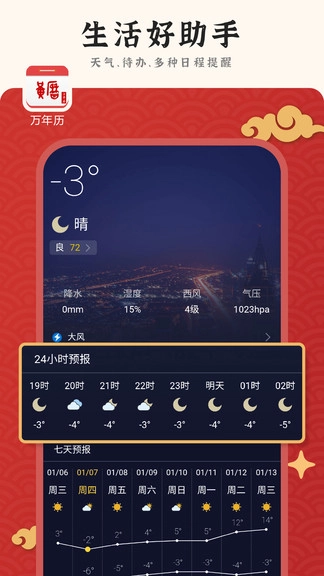 这款综合性日历软件整合了黄历、农历(阴历)信息、天气预测、事项提醒、星座查询等多种实用功能。
