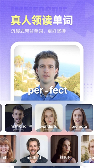 1、每个单词都配备专属教学视频,通过实景领读模式,由好莱坞演员在北美地标场景中亲自示范地道发音,指导口型模仿,并对单词进行分音节拆解教学。