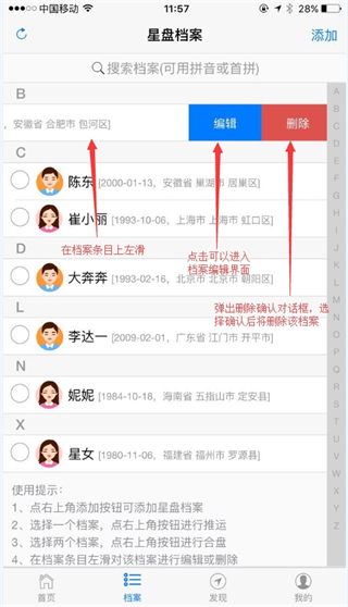 在档案条目处,按住条目向左滑动,就能调出该条档案的操作菜单,你可以借助菜单对该档案执行编辑和删除操作。