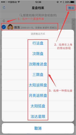 参考上面对应的“如何进行排合盘”流程,只不过在星盘档案页面,静静选择一个档案即可