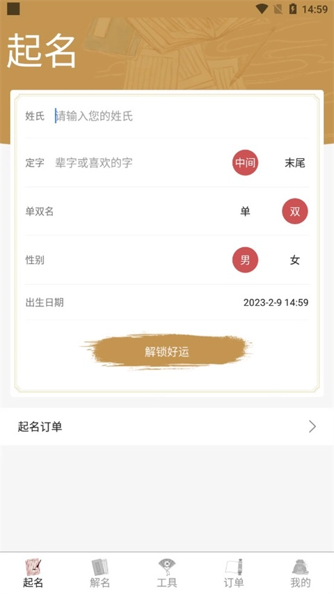 2、点击起名,输入相关的信息,一键查询名字;