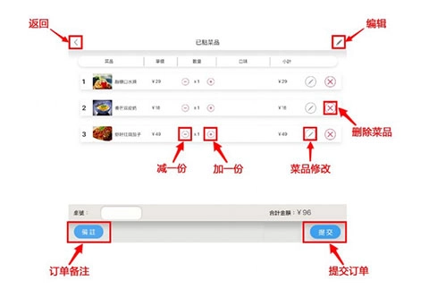 选择完菜品后,所有的选择都会记录在购物车中,在菜单主页及菜品列表页均可进入购物车,界面如下图所示: